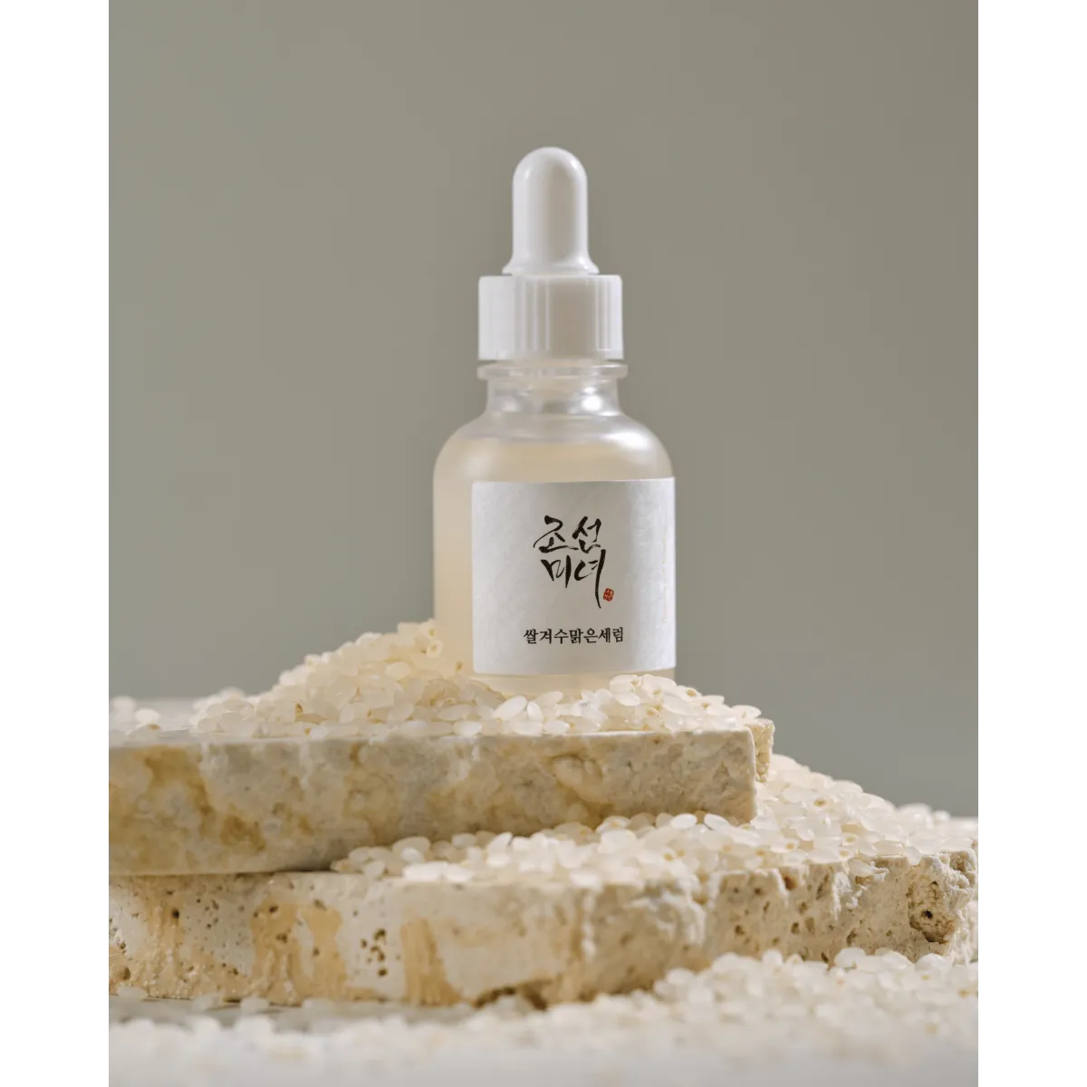 Actifs clés : eau de son de riz (acides aminés, minéraux), alpha‑arbutine (inhibe la production de mélanine), niacinamide, panthénol, glycérine, tréhalose, arginine, extraits de plantes (coptis japonica, soja, orge, sésame, blé, maïs, haricot mungo).
