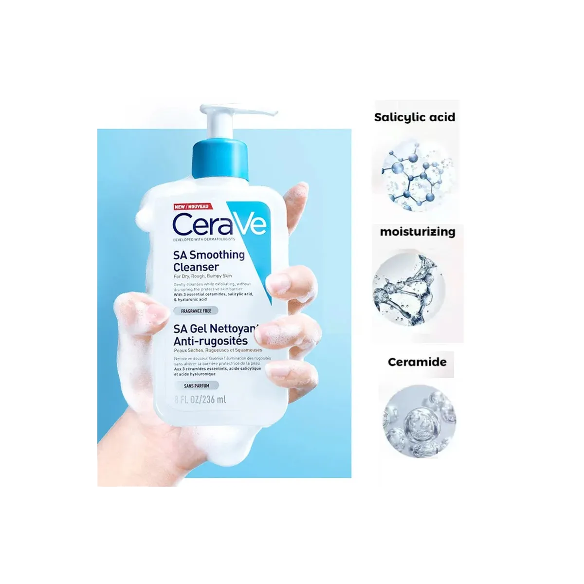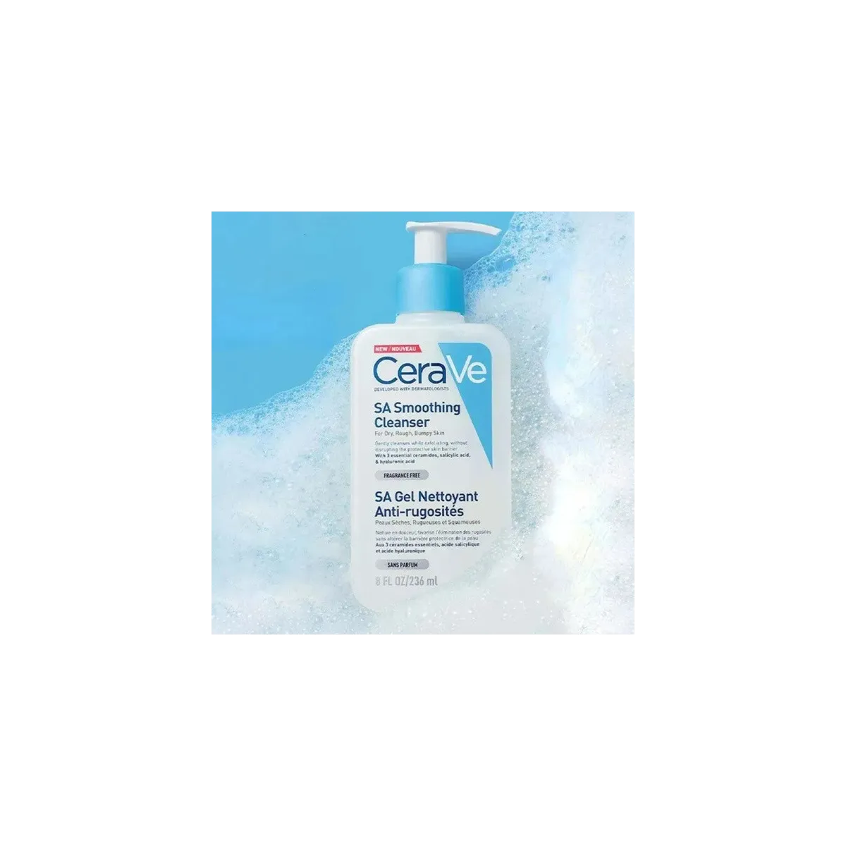 Le CeraVe SA Gel Nettoyant Anti-Rugosités est spécialement formulé avec des dermatologues pour nettoyer en douceur et favoriser l'élimination des rugosités des peaux sèches, rugueuses et squameuses, y compris celles sujettes à la kératose pilaire.