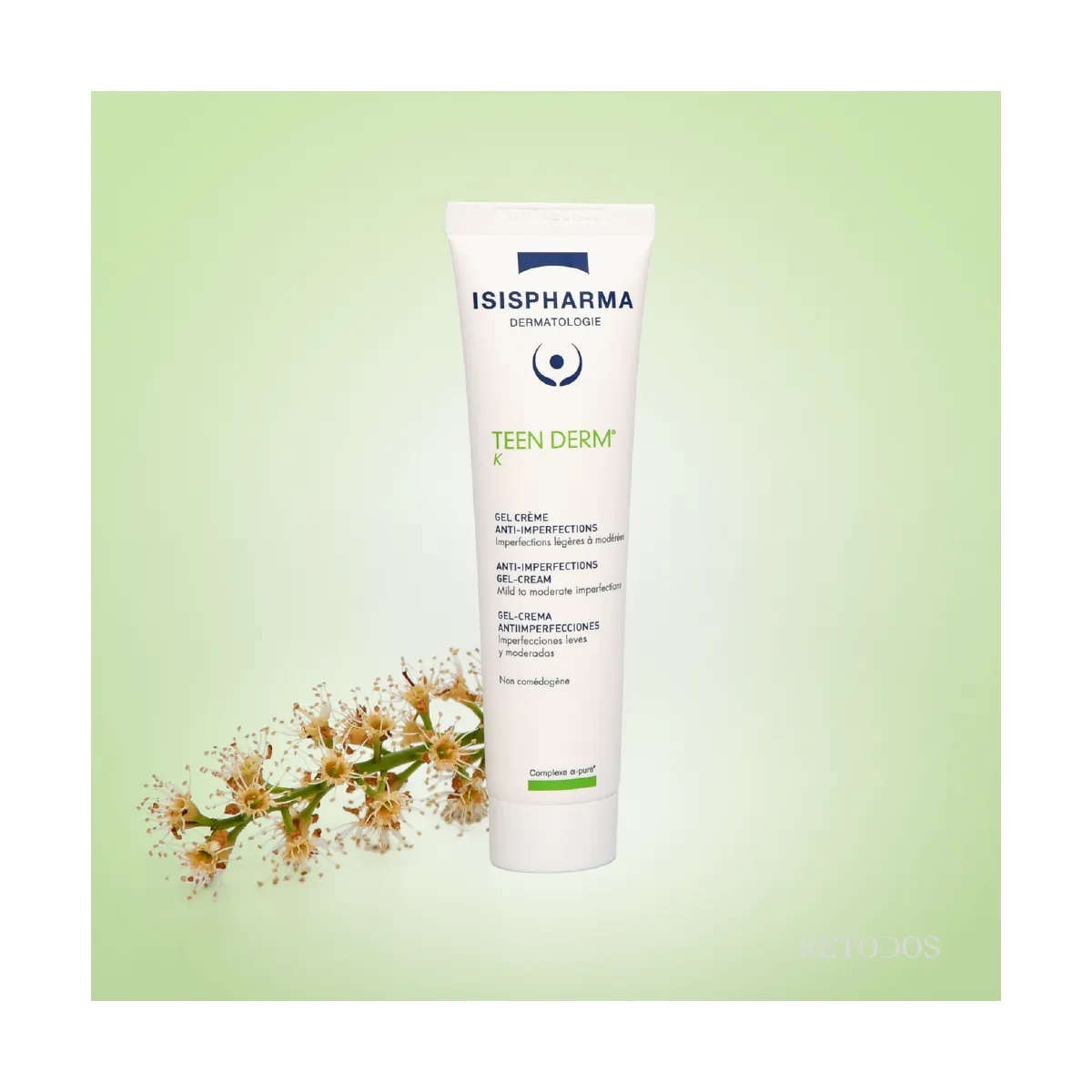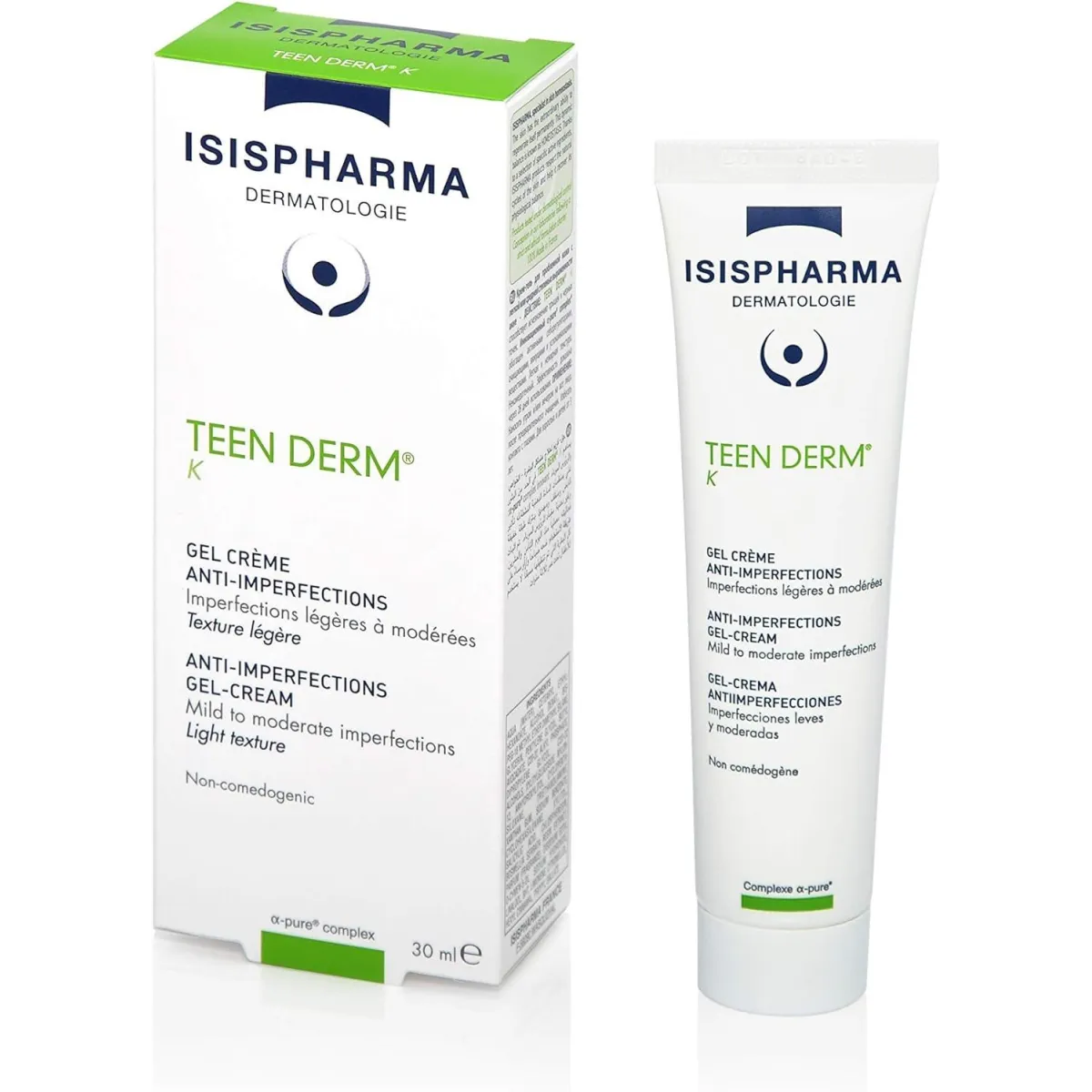 Le gel crème anti-imperfections TEEN DERM® K d'ISISPHARMA favorise l'élimination des boutons et points noirs grâce au complexe innovant a-PURE® riche en actifs séborégulateurs, astringents, purifiants et apaisants.