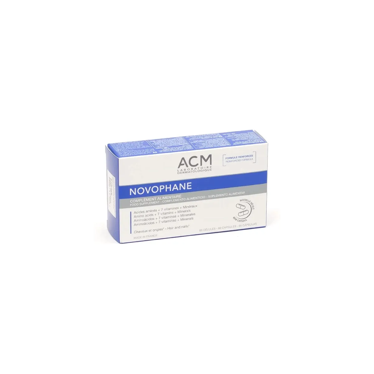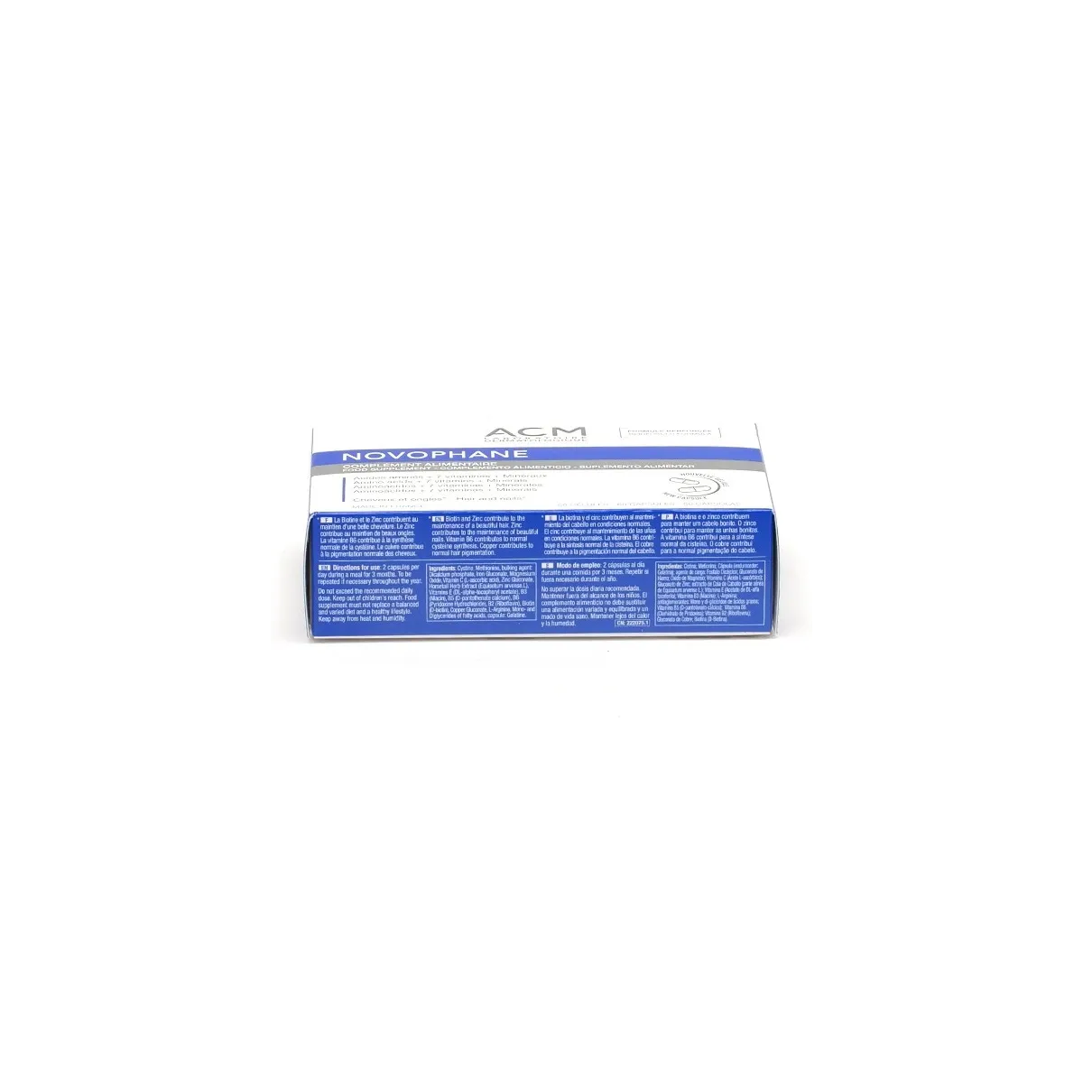 ACM Novophane Ongles Cheveux est un complément alimentaire à formule renforcée qui agit à la fois sur la beauté des ongles et des cheveux. Enrichi en acides aminés soufrés (cystine et méthionine), 7 vitamines essentielles et minéraux, ce complexe nutritionnel redonne force, vigueur et résistance aux phanères fragilisés.