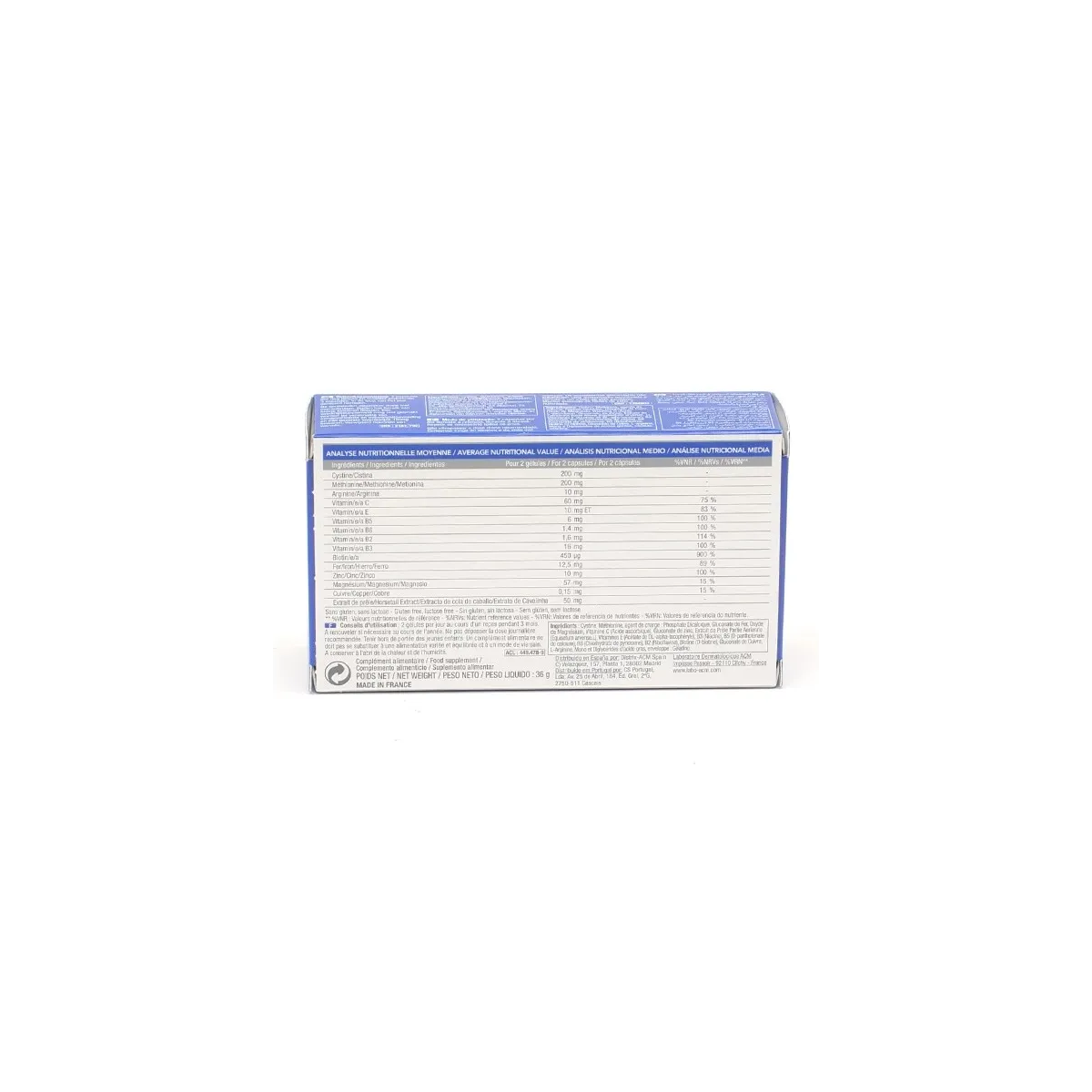 Idéal en cas de chute de cheveux saisonnière, cheveux fins ou cassants, ongles fragiles qui se dédoublent. Efficacité cliniquement prouvée dès 6 semaines avec +35% d'augmentation du rapport anagène/télogène. Sans gluten, sans lactose. Fabriqué en France par les laboratoires ACM.
